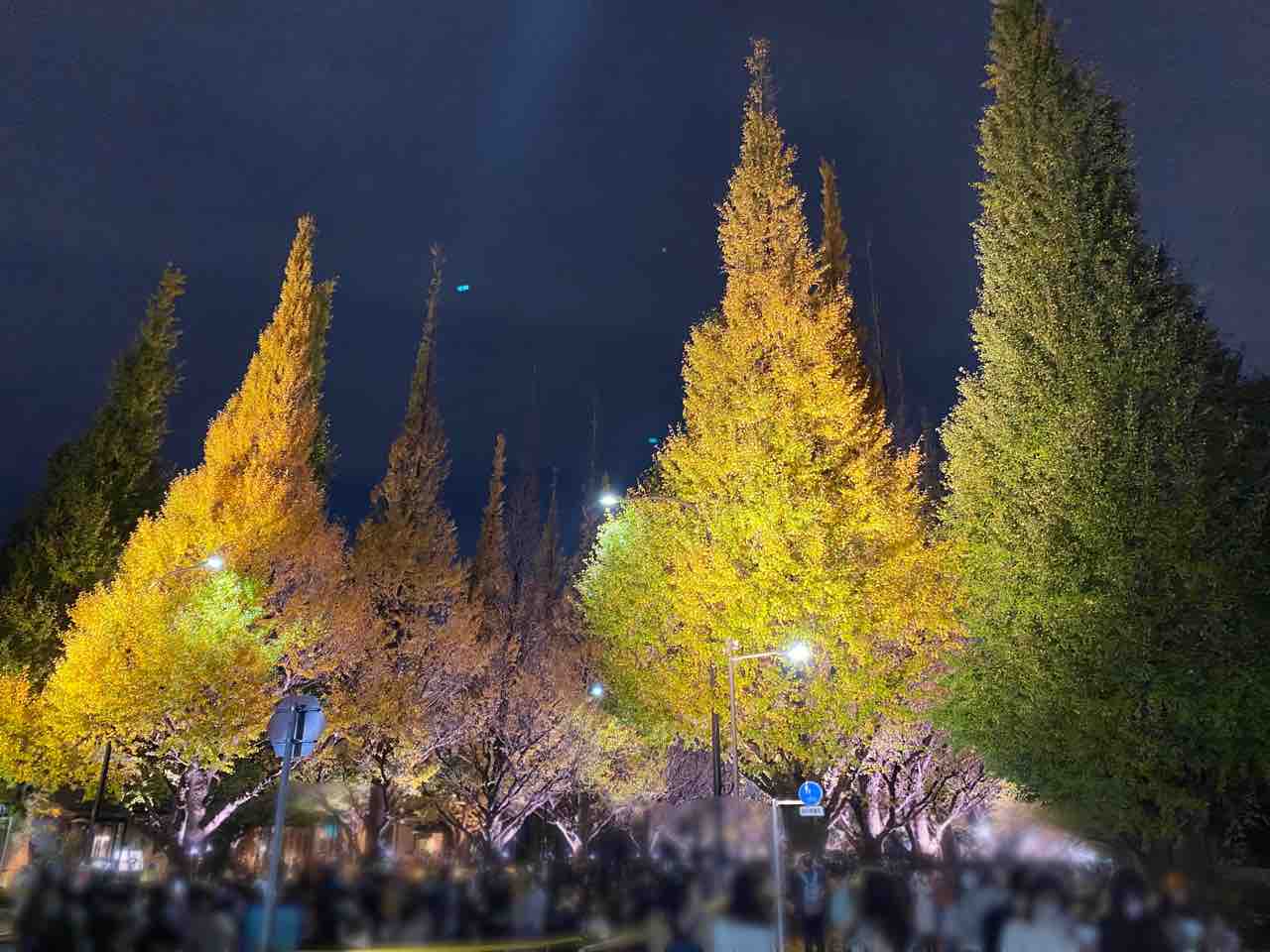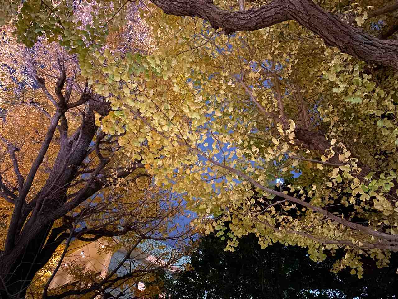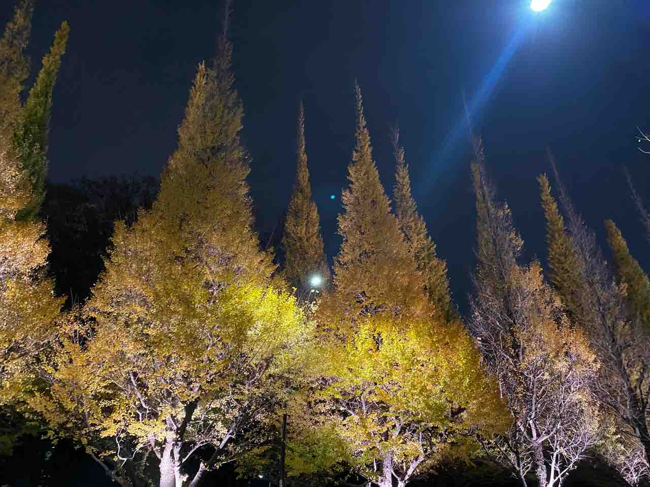 ライトに照らされたイチョウ。