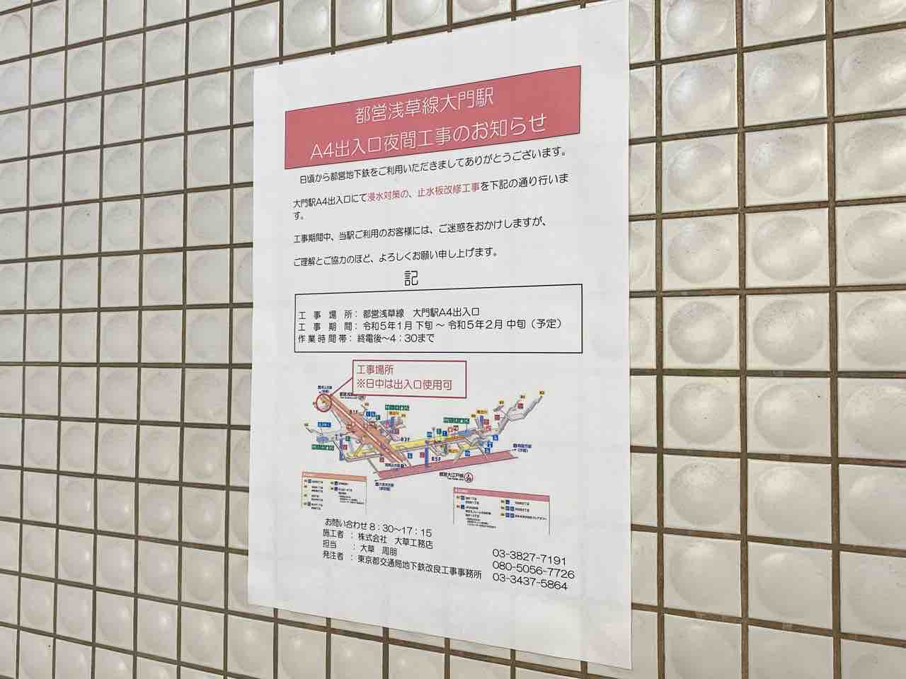 ※浅草線大門駅A4出入口夜間工事についての詳細は、こちら。